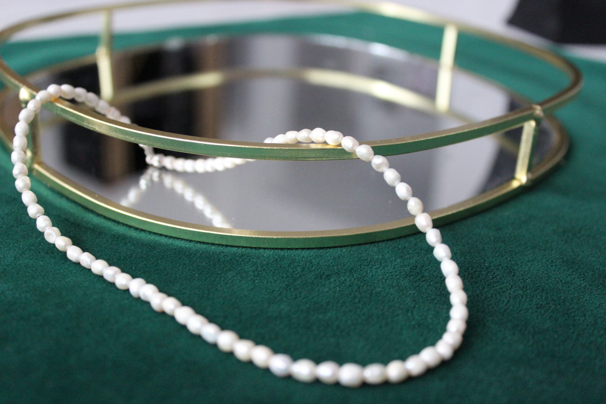 Ten wyjątkowo delikatny naszyjnik z naturalnych pereł emanuje subtelną elegancją i klasycznym urokiem. Drobne, idealnie skomponowane perełki tworzą minimalistyczny sznur, który pięknie układa się na dekolcie, dodając stylizacji świeżości i lekkości.